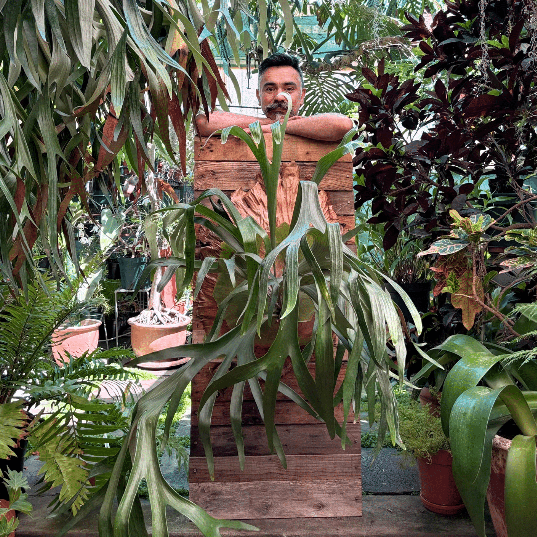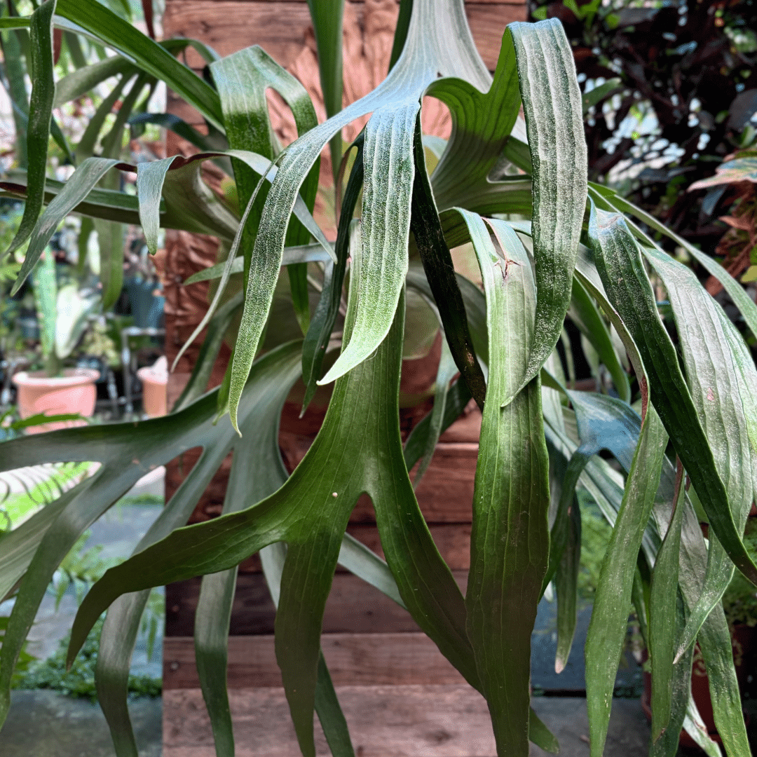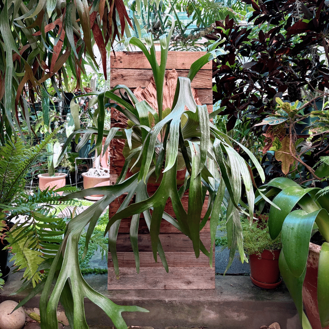 Mounted Staghorn Fern, a remarkable epiphytic plant known for its unique, antler-like fronds. This beautiful specimen thrives on a mounted surface, making it an eye-catching addition to any wall or garden display.