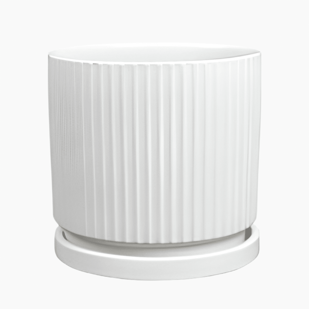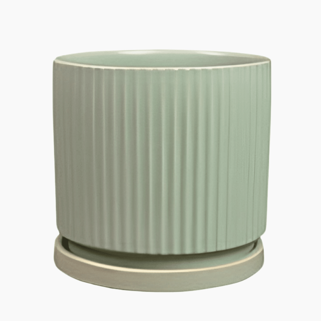 Elevate your indoor plants with our stylish Siebe pot and saucer. Glazed ceramic, ribbed texture, and drainage holes. Available in mint green and white.