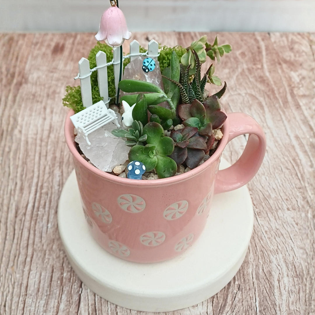 Add a whimsical touch of greenery to your home or workspace with this Succulent Mug Garden, a delightful mini fairy garden in a ceramic cup.
